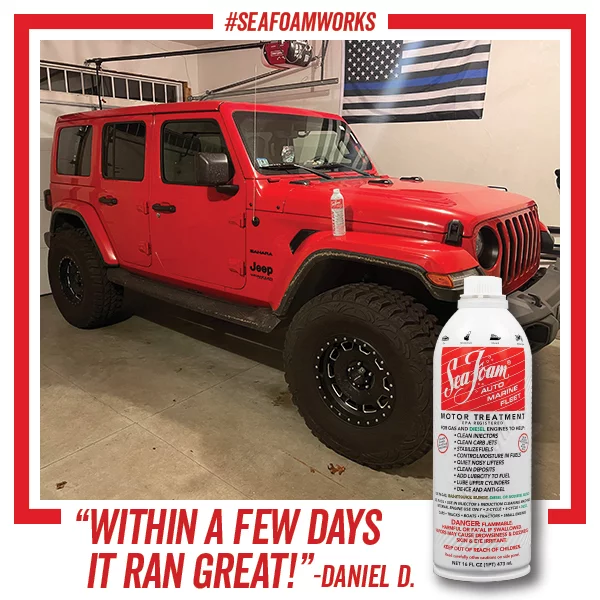 “I just want to say how happy I am with your product! My wife’s 2019 Jeep Wrangler with only 36,000 miles was not running right. The check engine light was not on so we had no way to diagnose the problem. An auto parts store employee suggested it might have water in the gas. I used your Sea Foam Motor Treatment and within a few days the Jeep ran great! Thank you!”